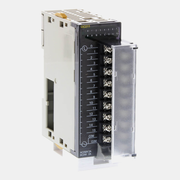 Omron CJ1W-OC211 Digital output unit, 16 x relay outputs, 250 VAC/24 VDC, 2 A max, screw terminal. CJ-series Digital I/O Units, 8 to 64 points per unit - input, output or mixed. A Wide Range of Basic Input Units for High Speed Input and Different Applications. Receive ON/OFF signals from external devices into the PLC System to update I/O memory in the CPU Unit.